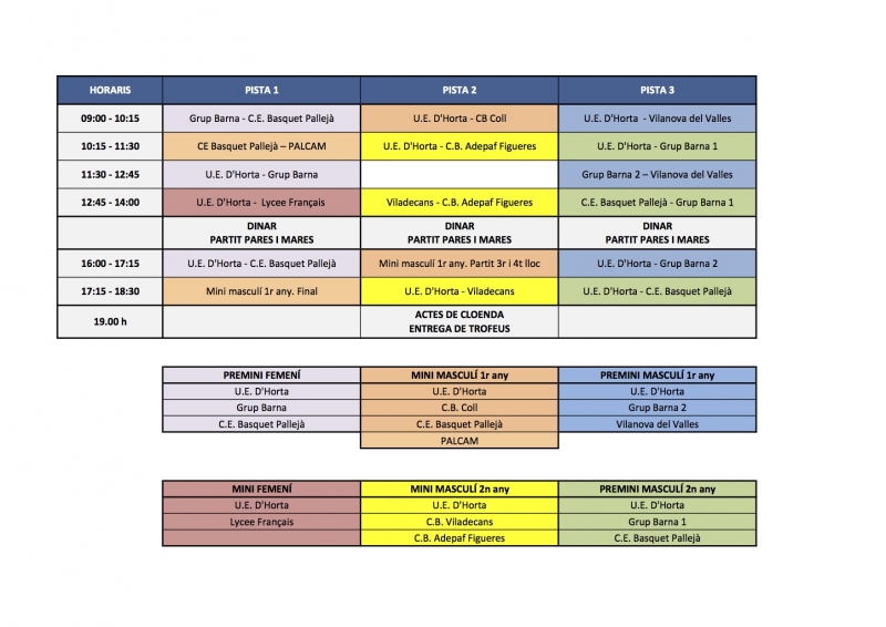 Aquí trobareu el calendari dels partits amb els horaris i la pista de joc. Tots els equips hauran d’estar a la instal·lació mitja hora abans de començar els partits. Els equips hauran de portar la seva segona equipació (si en tenen).