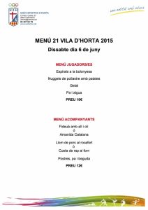 Aquí podeu trobar el menú del torneig amb els torns de dinar. Encara falta per assignar a cada equip el seu horari que anirà en funció dels seus partits. Aquí podeu veure i descarregar tota la informació sobre aquest punt. A cada equip/jugador se li entregarà un tiquet (el preu és de 10€) a presentar al restaurant. Aquests es poden adquirir prèviament (és aconsellable) o el mateix dia al mateix restaurant. Si qualsevol persona té necessitats alimentàries especials ho ha de comunicar prèviament.