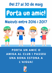 El pròxim 27,28, 29 i 30 de maig celebrarem a les nostres instal·lacions la jornada de porta un amic amb els nedadors i les nedadores dels anys 2016 i 2017 de la secció!! No us ho perdeu!! Veniu i gaudiu de la piscina!