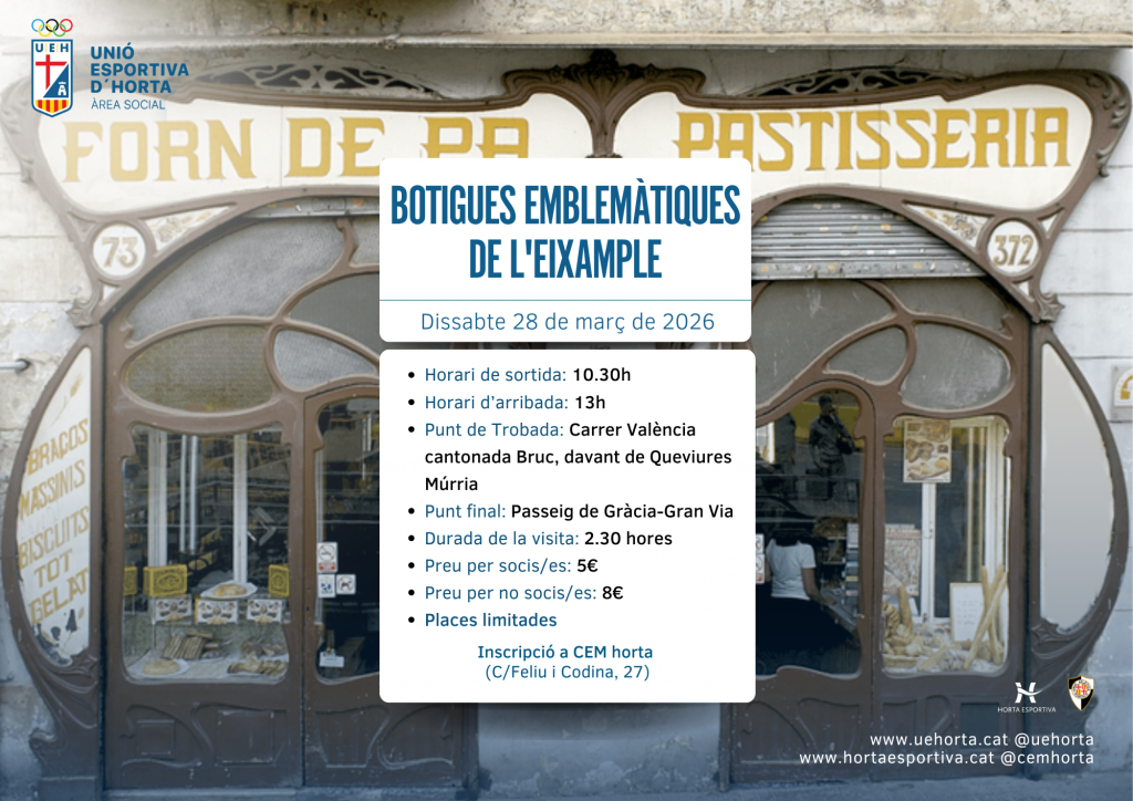 El pròxim dissabte 28 de març, des de l’Àrea Social de la U.E. d’Horta, us proposem una nova sortida cultural per descobrir alguns dels racons amb més història de Barcelona.