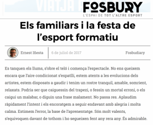 La revista digital Fosbury ha publicat aquest mes un article de l’Ernest Iñesta que porta com a títol: Els familiars i la festa de l’esport formatiu. L’Ernest, a més de ser àrbitre internacional de waterpolo i psicopedacoach esportiu i formatiu, és pare d’esportistes. Des dels seus coneixements i la seva experiència, ens ajuda amb aquesta publicació a entendre la influència que té l’actitud dels pares en la diversió dels nostres fills. Que, tot i que sovint ens oblidem, és la principal finalitat de fer esport.