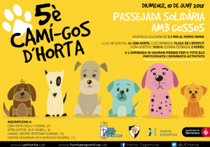 El proper diumenge 10 de juny, t’esperem a la cinquena edició del Camí-Gos, la ja tradicional caminada solidària amb gossos pel barri d’Horta. Per només 3 euros, inscripció que destinarem íntegrament a El Perro Verde, gaudirem durant dues hores d’un passeig pel districte començant al CEM Horta i acabant a Plaça de l’Estatut.