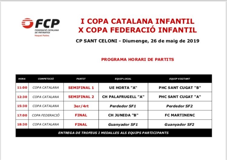 Demà dissabte, dia 23, els nostres nens d’escola participaran a la Trobada Final de les Lligues Recreatives de Menuts i Menudets d’Hoquei Patins del Consell de l’Esport Escolar de Barcelona (CEEB), que tindrà lloc a la Pista Coberta Cristina Clota del CP Congrés. La pista de joc es dividirà en 3 parts amb tanques mòbils…
