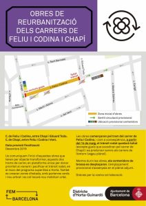 Els voltants de la Unió Esportiva d’Horta es troben en obres per la reurbanització dels carrers de Feliu i Codina i Chapí. La data prevista per a la finalització d’aquestes és desembre 2019. La finalitat d’aquestes obres és transformar aquests dos trams de carrer en plataforma única per donar prioritat al vianant i pacificar el transit rodat en el marc del programa superilles a Horta. També es crearan zones d’estada amb parterres verda i nou arbrat i es col·locarà nou mobiliari urbà.
